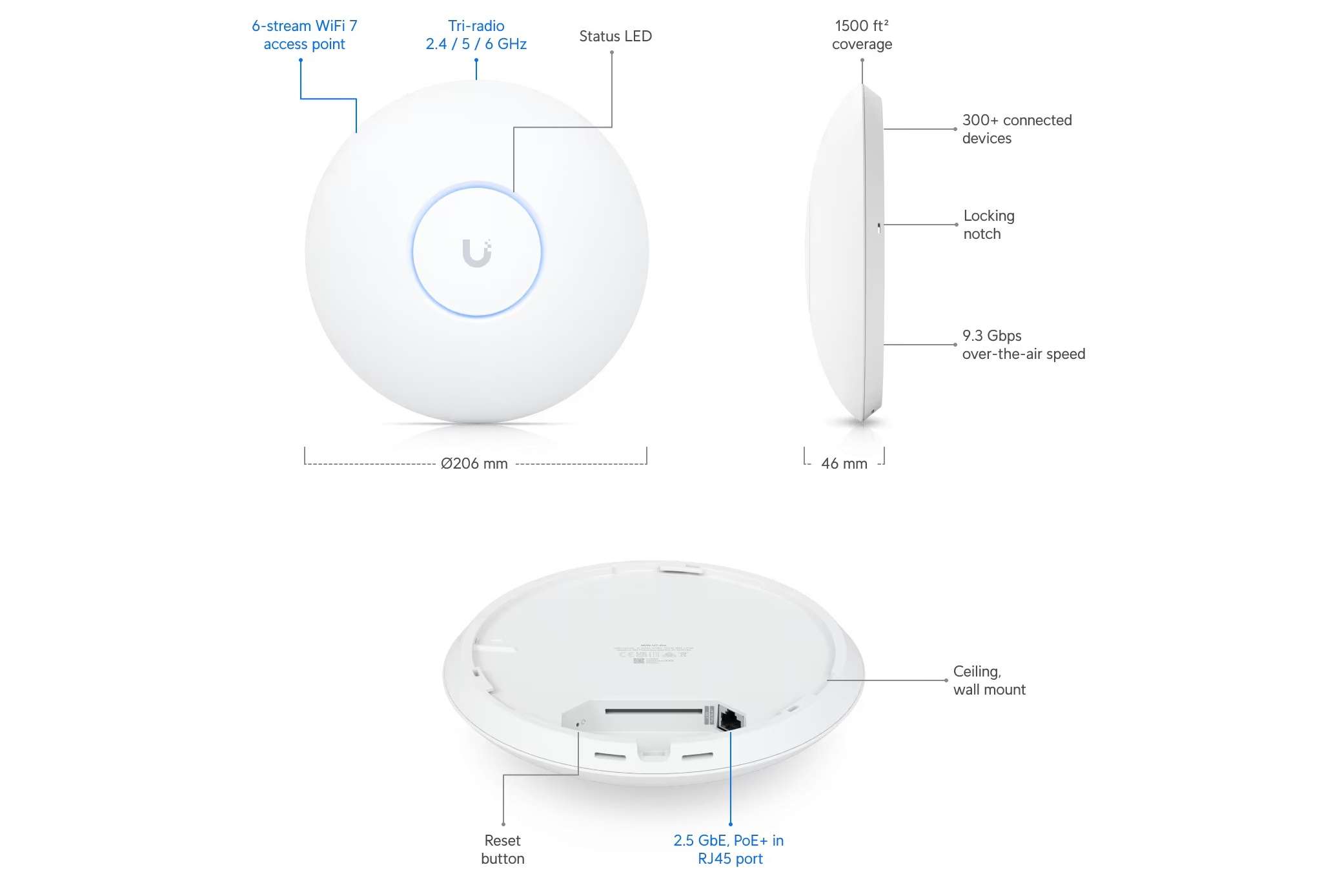 U7-Pro Ceiling-mounted WiFi 7 AP with 6 spatial streams and 6 GHz support for interference-free WiFi in demanding, large-scale environments.